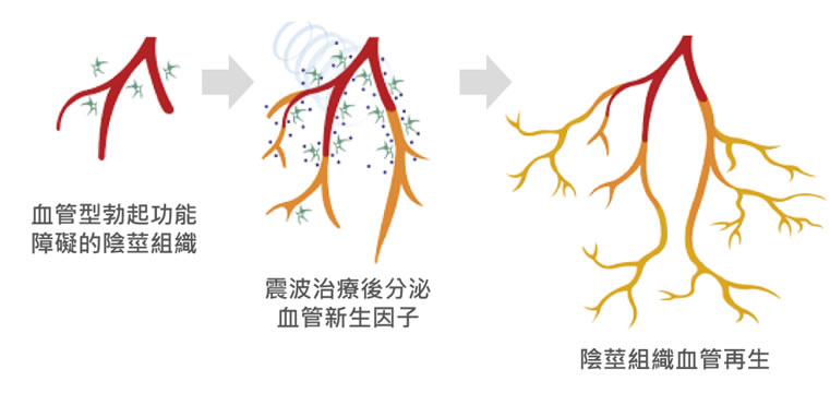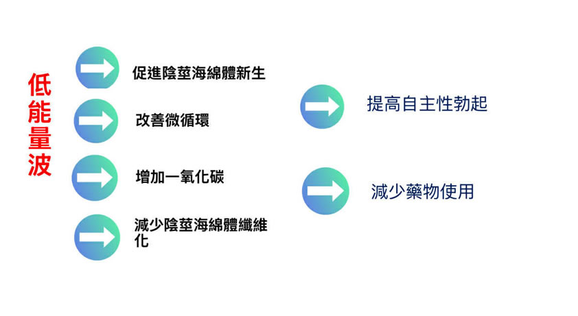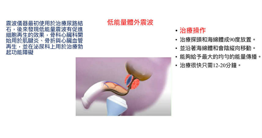 採用低能量震波治療,經過評估療程後,可以恢復晨勃,且行房時勃起硬度明顯改善,滿意另一半需求。男性過中年後,據統計有50%的人會感覺勃起功能變差,不是鬆軟無法插入,就是硬的時間縮短,很快軟掉。男性勃起功能障礙,俗稱陽痿,有多種原因,包括:常見的三高問題、三高藥物的副作用、心因性、器質性(還包括:男性賀爾蒙低下、血管性等)。例如中老年可能出現的心血管硬化或狹窄,同樣可能發生在支配陰莖的動脈。因此在矯正相關可能原因,如:男性賀爾蒙的補充、糖尿病的控制和高血壓的藥物調整後,若勃起功能尚未改善,經評估為血管性的陽痿後,可以考慮施行低能量體外震波治療。