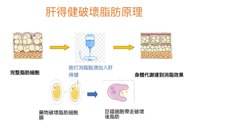 「肝得健」是一種含有磷脂質成分的藥物,主要用於改善肝功能和減少內臟脂肪,透過破壞脂肪細胞膜並將其乳化,促進身體代謝排除脂肪。 它能有助於降低脂肪肝、過高內臟脂肪及相關心血管疾病的風險。
