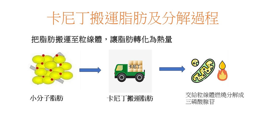 • 脂肪轉運 卡尼丁的主要功能是將脂肪酸搬運到細胞內的「粒腺體」中,作為能量的燃料來源。
