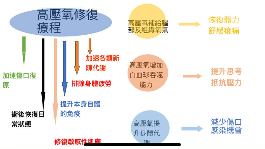 • 活化組織與促進癒合 在高壓環境下,氧氣更容易溶解於血漿,能有效提升血液和組織的含氧量,促進新陳代謝,活化缺氧組織,加速傷口癒合和皮膚修復