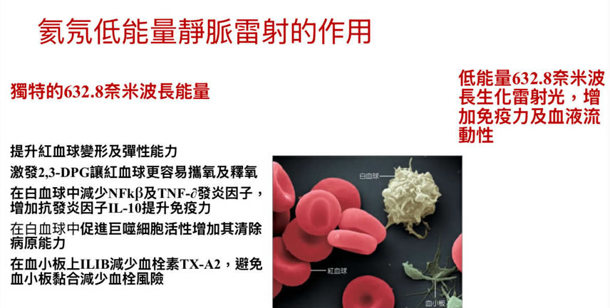 - 活化血液與細胞 利用低能量雷射光刺激血液中的紅血球與白血球,提升其攜氧能力和活性,並促進粒線體產生能量(ATP),使細胞功能活化。