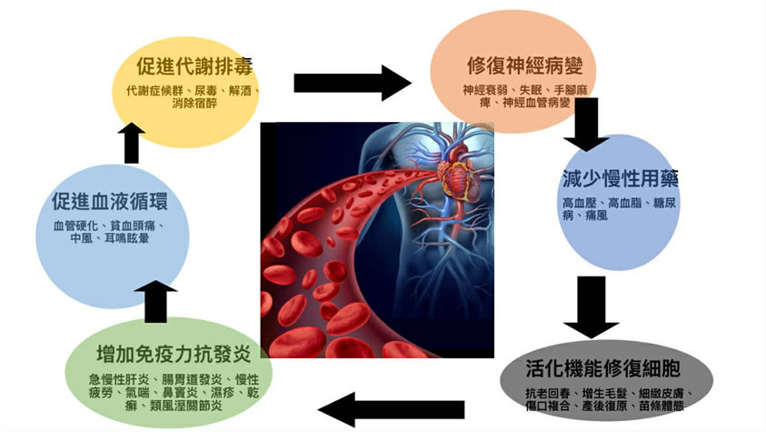 - 改善循環 增加紅血球的彈性與變形能力,使血液循環更順暢,降低血小板凝集,有助於預防中風與心肌梗塞。